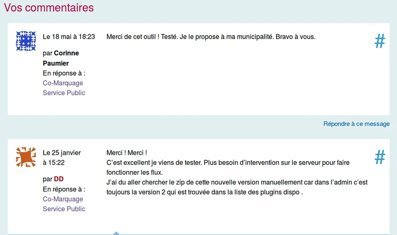 Sur le forum de la communauté SPIP des remerciements nous sont parvenus et nous savons aujourd’hui que notre plugin est utilisé sur plus d’une centaine de site internet.