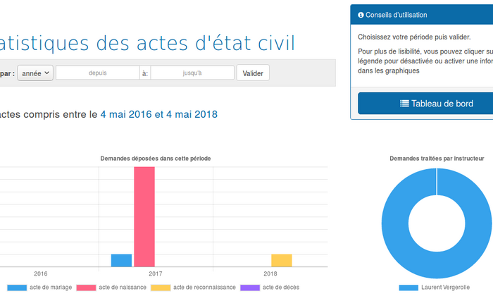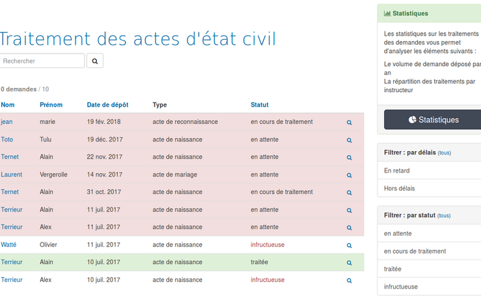 Interface d’administration des actes déposés pour les agents des services d’état-civil.