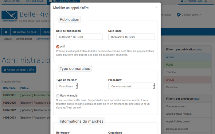 Une interface dédiée à la publication des appels d’offres et avis d’attribution, pour une diffusion transparente et accessible au public.