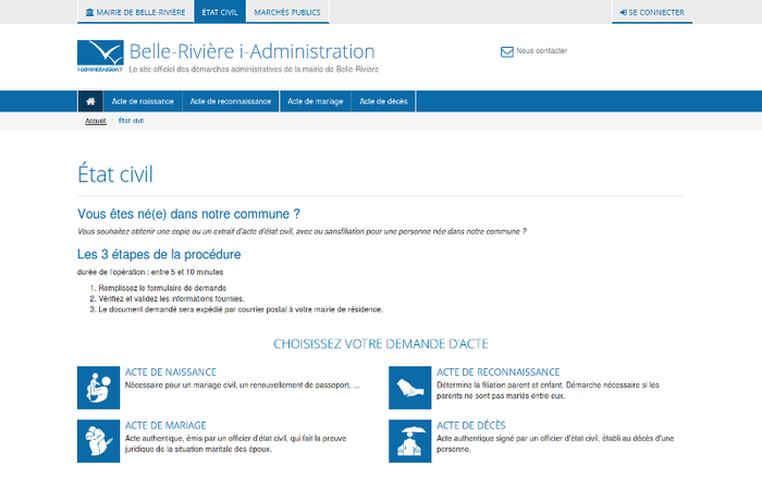Une page d’accueil claire permettant aux usagers d’accéder rapidement aux demandes d’actes d’état-civil : naissance, mariage, décès et reconnaissance.